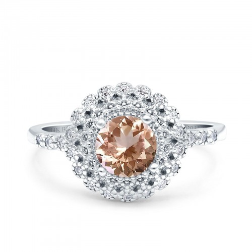 14K White Gold 0.77ct Halo Art Deco Round 5.5mm G SI Natural Morganite Diamond Engagement Wedding Ring Size 6.5