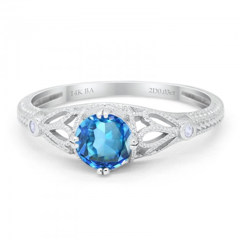 14K White Gold 0.87ct Vintage Design Solitaire Round 6mm G SI Natural Blue Topaz Diamond Engagement Wedding Ring Size 6.5