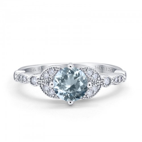 14K White Gold 0.96ct Round Art Deco 6mm G SI Natural Aquamarine Diamond Engagement Wedding Ring Size 6.5