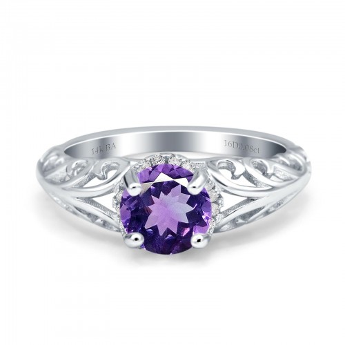 14K White Gold 1.11ct Round Art Deco Filigree 6.5mm G SI Natural Amethyst Diamond Engagement Wedding Ring Size 6.5