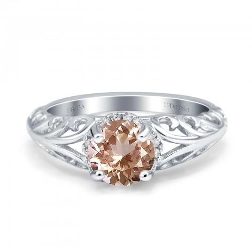 14K White Gold 1.11ct Round Art Deco Filigree 6.5mm G SI Natural Morganite Diamond Engagement Wedding Ring Size 6.5