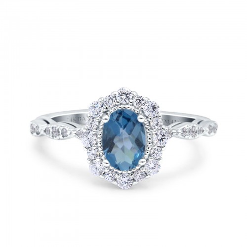 14K White Gold 1.19ct Vintage Art Deco Halo Oval 7mmx5mm G SI London Blue Topaz Diamond Engagement Wedding Ring Size 6.5