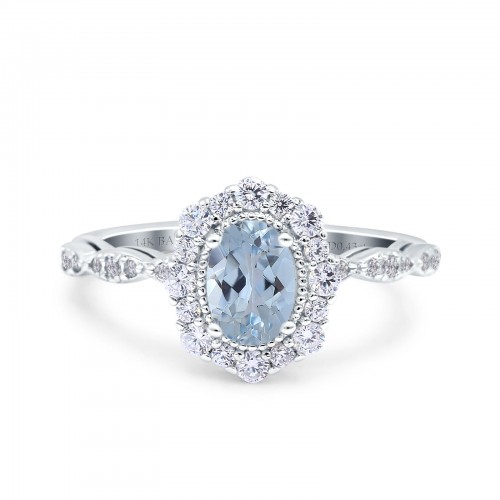 14K White Gold 1.19ct Vintage Art Deco Halo Oval 7mmx5mm G SI Natural Aquamarine Diamond Engagement Wedding Ring Size 6.5