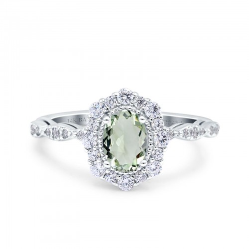 14K White Gold 1.19ct Vintage Art Deco Halo Oval 7mmx5mm G SI Natural Green Amethyst Diamond Engagement Wedding Ring Size 6.5