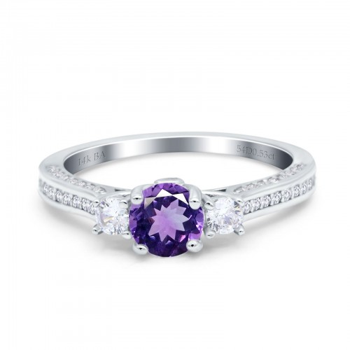 14K White Gold 1.37ct Round Three Stone Vintage 6mm G SI Natural Amethyst Diamond Engagement Wedding Ring Size 6.5