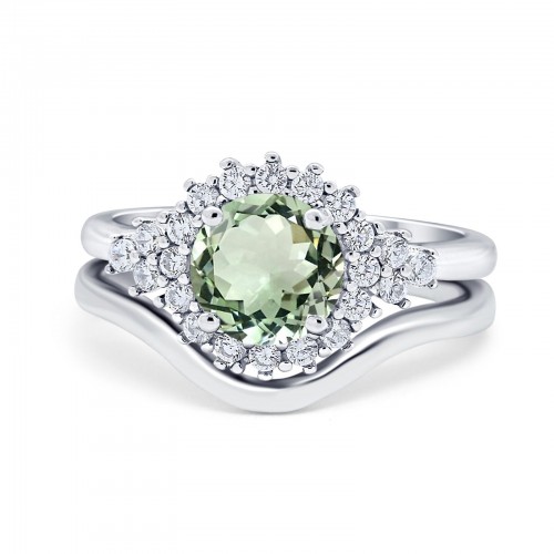 14K White Gold 1.59ct Round Two Piece Halo 7mm G SI Natural Green Amethyst Diamond Engagement Wedding Ring Size 6.5