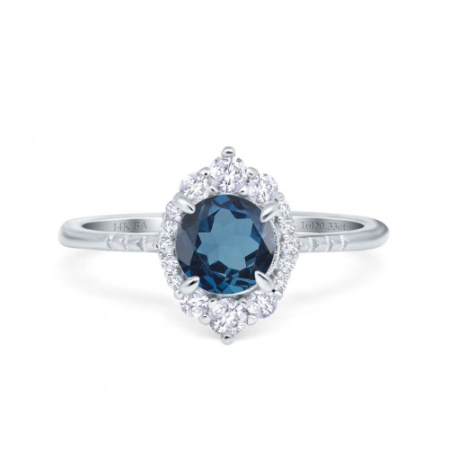 14K White Gold 1.61ct Halo Vintage Round 7mm G SI London Blue Topaz Diamond Engagement Wedding Ring Size 6.5