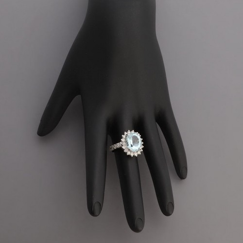 This 14K White Gold Aquamarine Diamond Ring is a real showstopper with its 12mm by 10mm round, prong-set faceted stone surrounded by a halo of prong-set white diamonds! The bling doesn’t end there as prong-set white diamonds run halfway down the shank on each side for a total carat weight of approximately 0.82. In very good condition, it has scratches on the metal. This classically styled pale aquamarine ring can be used as a birthstone, engagement or fashion ring, or as a just-because to bejewel your lovely hand!