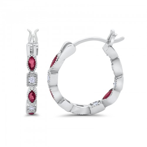 14K White Gold Art Deco Hoop Earrings Marquise Round Simulated Ruby CZ