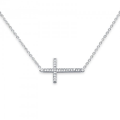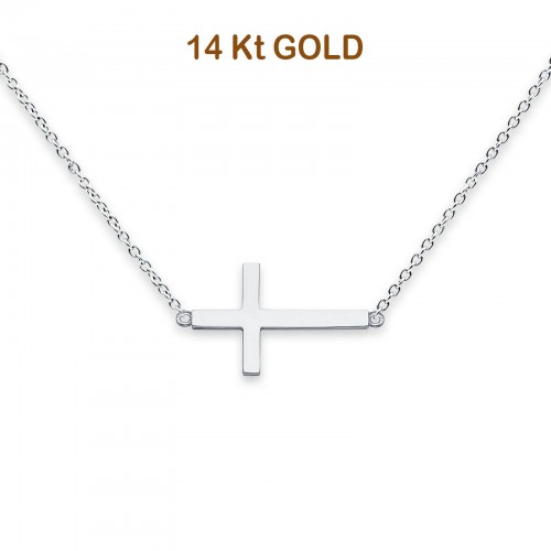 14K White Gold CZ Side Way Cross Necklace 17″ + 1″ Extension