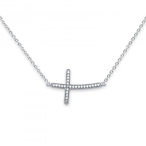 14K White Gold CZ Side Way Cross Necklace 17″ + 1″ Extension