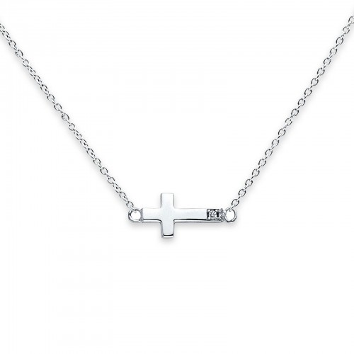 14K White Gold CZ Side Way Cross Necklace 17″ + 1″ Extension