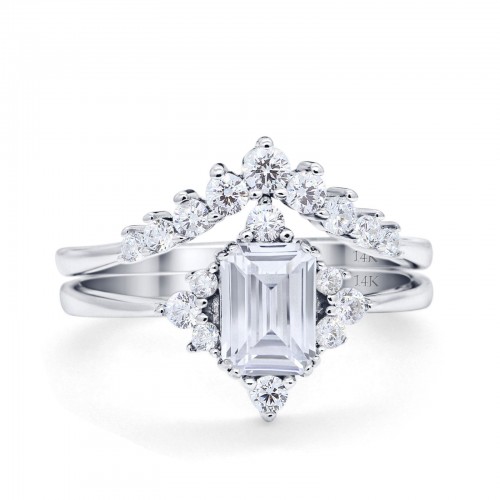 14K White Gold Emerald Cut Art Deco Two Piece Bridal Set Ring Engagement Band Simulated CZ Size-7