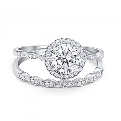 14K White Gold Two Piece Round Wedding Ring Bridal Set Band Engagement Simulated CZ Size-7