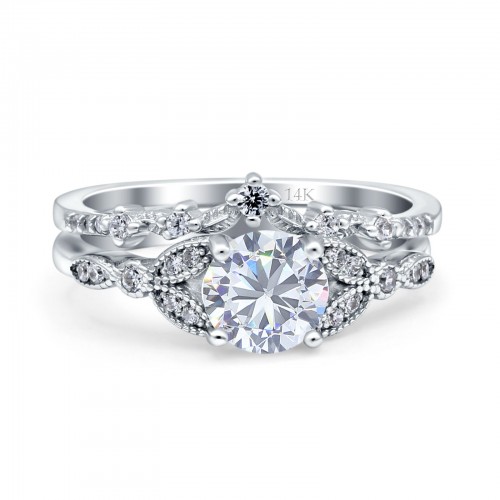 14K White Gold Two Piece Vintage Style Bridal Set Round Simulated Cubic Zirconia Wedding Ring 7