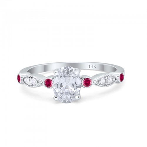 14K White Gold Vintage Style Oval Bridal Ruby Simulated CZ Wedding Engagement Ring Size 7 14K Gold