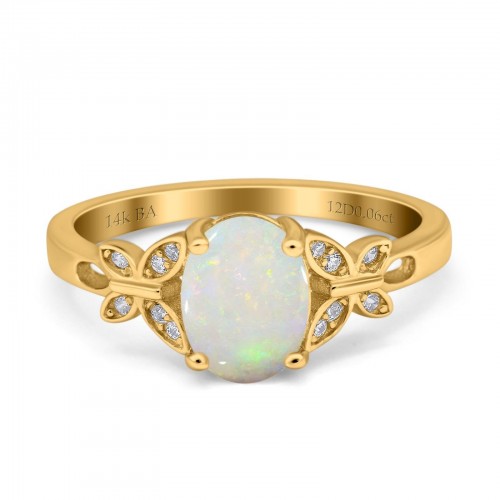 14K Yellow Gold 0.06ct Oval 8mmx6mm Butterfly Accent G SI Natural White Opal Diamond Engagement Wedding Ring Size 6.5