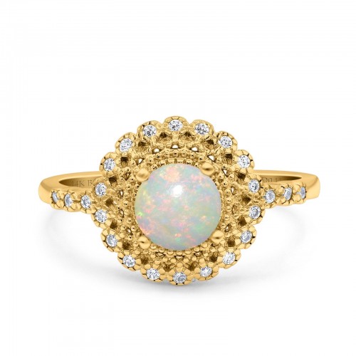 14K Yellow Gold 0.11ct Halo Art Deco Round 5.5mm G SI Natural White Opal Diamond Engagement Wedding Ring Size 6.5