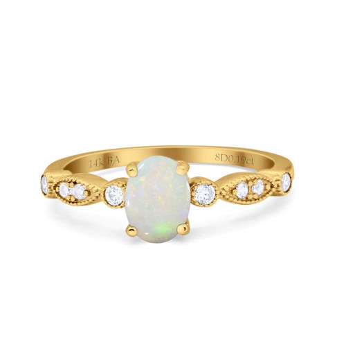 14K Yellow Gold 0.19ct Oval Vintage Style 8mmx6mm G SI Natural White Opal Diamond Engagement Wedding Ring Size 6.5