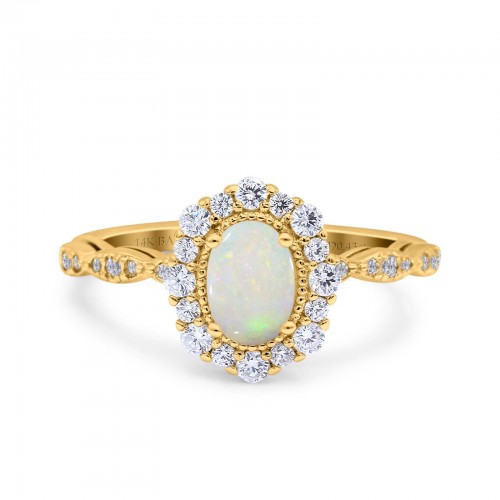 14K Yellow Gold 0.43ct Vintage Art Deco Halo Oval 7mmx5mm G SI Natural White Opal Diamond Engagement Wedding Ring Size 6.5
