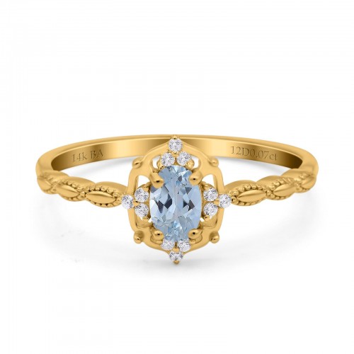 14K Yellow Gold 0.5ct Oval Vintage Floral 6mmx4mm G SI Natural Aquamarine Diamond Engagement Wedding Ring Size 6.5