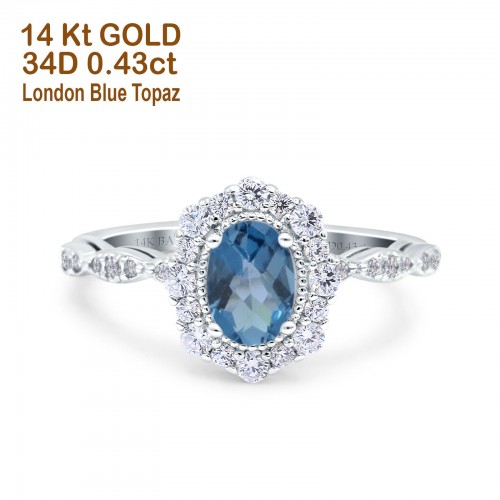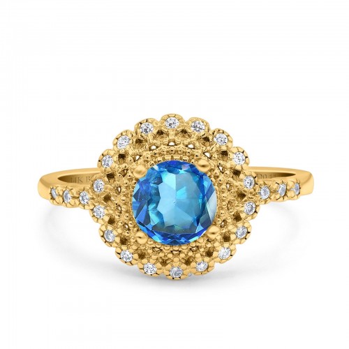 14K Yellow Gold 0.77ct Halo Art Deco Round 5.5mm G SI Natural Blue Topaz Diamond Engagement Wedding Ring Size 6.5