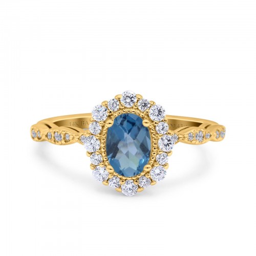 14K Yellow Gold 1.19ct Vintage Art Deco Halo Oval 7mmx5mm G SI London Blue Topaz Diamond Engagement Wedding Ring Size 6.5