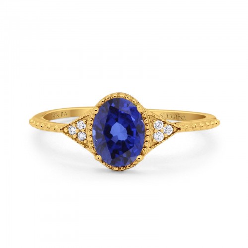 14K Yellow Gold 1.26ct Oval Art Deco 8mmx6mm G SI Lab Blue Sapphire Diamond Engagement Wedding Ring Size 6.5