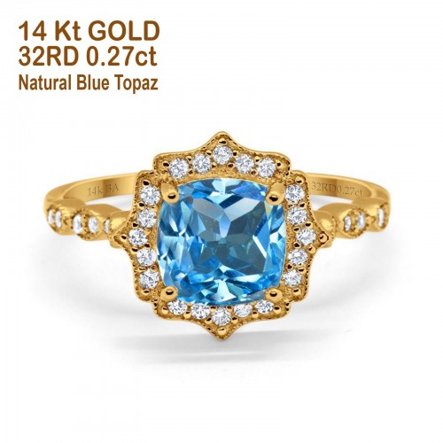 14K Yellow Gold 1.37ct Round Three Stone Vintage 6mm G SI Nano Blue Sapphire Diamond Engagement Wedding Ring Size 6.5
