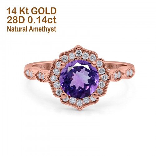 14K Yellow Gold 1.42ct Art Deco Round 7mm G SI Natural Amethyst Diamond Engagement Wedding Ring Size 6.5