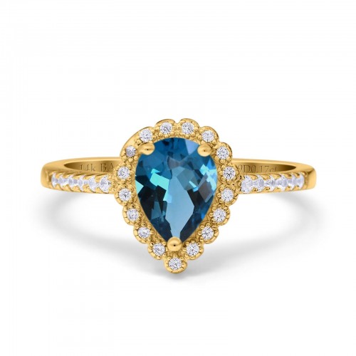 14K Yellow Gold 1.42ct Teardrop Pear Halo 8mmx6mm G SI London Blue Topaz Diamond Engagement Wedding Ring Size 6.5