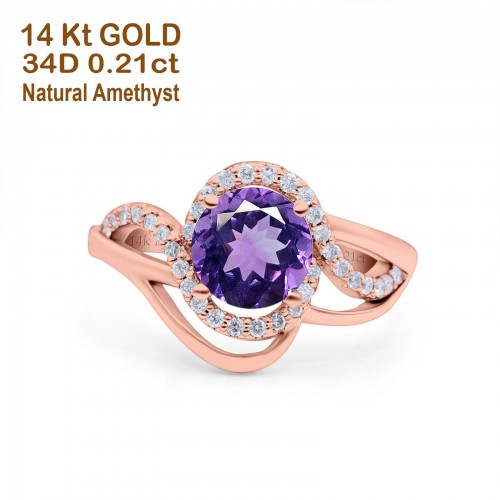 14K Yellow Gold 1.49ct Art Deco Round 7mm G SI Natural Amethyst Diamond Engagement Wedding Ring Size 6.5