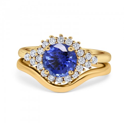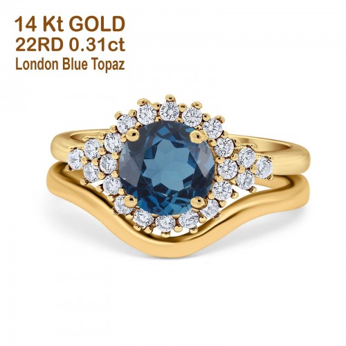 14K Yellow Gold 1.59ct Round Two Piece Halo 7mm G SI Nano Blue Sapphire Diamond Engagement Wedding Ring Size 6.5