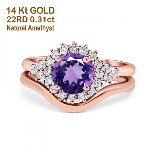 14K Yellow Gold 1.59ct Round Two Piece Halo 7mm G SI Natural Amethyst Diamond Engagement Wedding Ring Size 6.5