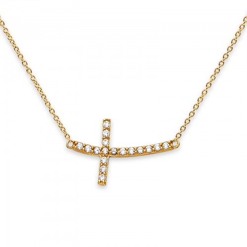 14K Yellow Gold Bended CZ Sideways Cross Necklace 17″ + 1″ Extension