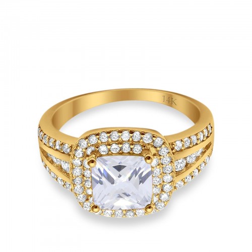 14K Yellow Gold Halo Art Deco Wedding Ring Princess Cut Round Simulated CZ Size-7 14K Gold