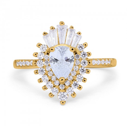 14K Yellow Gold Pear Engagement Ring Baguette Simulated Cubic Zirconia Size-7