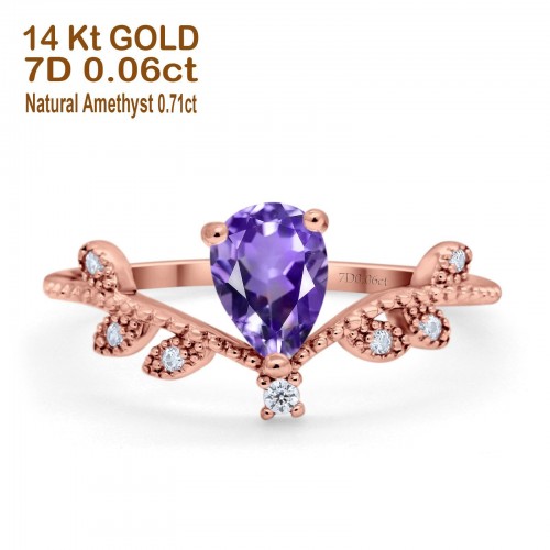 14K Yellow Gold Pear Natural Amethyst 0.77ct G SI Diamond Engagement Ring Size 6.5
