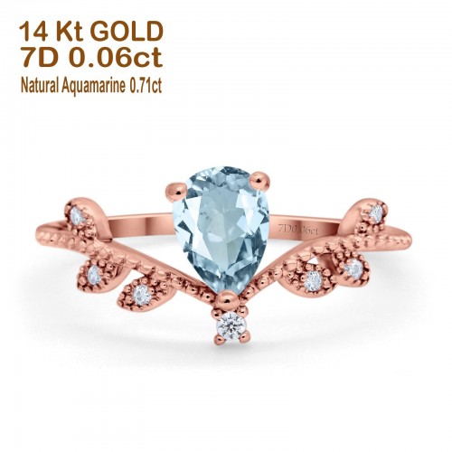 14K Yellow Gold Pear Natural Aquamarine 0.77ct G SI Diamond Engagement Ring Size 6.5