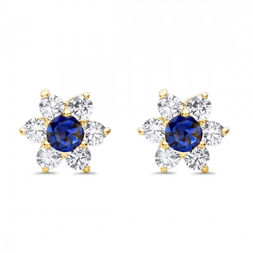 14K Yellow Gold Simulated Blue Sapphire CZ Flower Stud Earrings with Screw Back, Best Anniversary Birthday Gift for Her