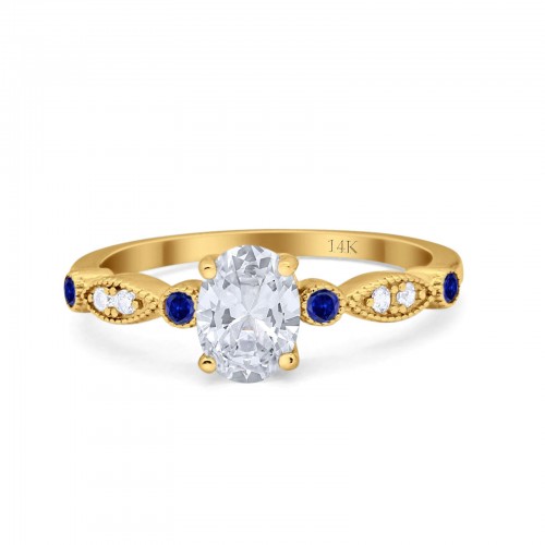14K Yellow Gold Vintage Style Oval Bridal Blue Sapphire Simulated CZ Wedding Engagement Ring Size 7 14K Gold