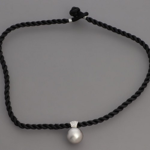 This 18K White Gold and Diamond Necklace has a 15-millimeter show-stopping Gray Tahitian Pearl pendant! The pearl is attached to an 18K white gold bail studded with approximately 20 small, prong-set white diamonds and looped through a black silk woven cord with a toggle closure. In very good condition, it has a bit of glue on the top at the back that is not visible from the front and a small natural flaw in the lacquer. This nicely sized pearl has an alluring sheen, just one of the mysterious assets of a Tahitian South Sea pearl!