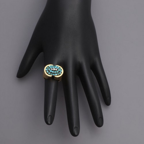 This unique 18K Yellow Gold Turquoise and Diamond Ring is a conversation-starter if ever I saw one! The oval top measures 18 millimeters by 13 millimeters and the raised, ribbed 18K yellow gold setting features 26 prong-set turquoise stones with three small diamonds in the center and a slender shank for comfort. In very good condition, it is gently worn. This ring sits well above the finger for a taste of the high life!