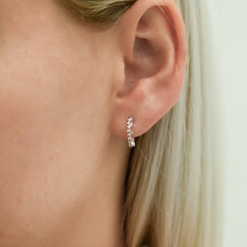 These 14K white gold scatter hoop huggie earrings feature 0.21 carats total weight of baguette and round diamonds for a modern, textured sparkle.