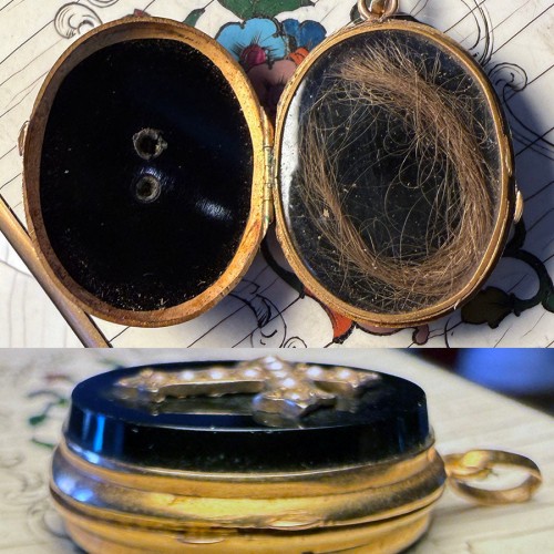 Antique 16k Gold Mounted (5.80 grams gross) mourning locket, Onyx mounted with enameled 16k gold cross set with seed pearls. Seed pearls represented the tears of the mourner.. Not engraved, but most often pale blond hair was that of an infant or child.
