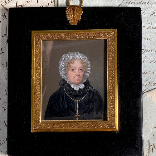 Antique 18th Century French Portrait Miniature of a Matron in Cape, Lace Bonnet and Elaborate Jeweled Cross & Chain