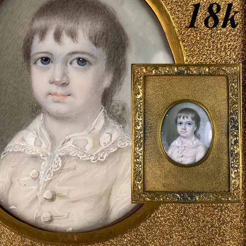 This elegant 18th century gentleman’s portrait was once the clasp fo a bracelet. You see the fittings at the top and bottom ends, which are also slightly wider than at center to fit the curve of wrist. I’ve had pairs of Georgian bracelets with many rows of seed pearls, and a portrait miniature as clasp like this. For my interest in it, it was the superb painting in miniature, an English gentleman in red top coat. Found in England. Full measurements noted on the photos.