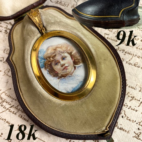 Antique c.1770 French Portrait Miniature, Rare 18k Gold Frame w Heart Lock and Key