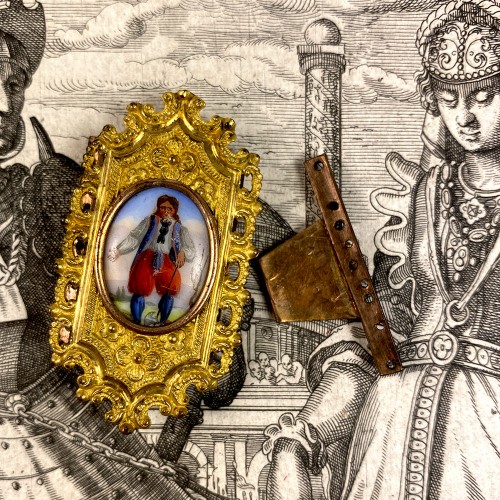 With the bale up top, likely worn on a silver or gold chain, or perhaps from a chatelaine, this dainty little 18k vermeil interior and sterling silver box is a vinaigrette. Into it would be a wad of wool or cotton onto which drops of scented oils or perfume would be added. One need only open the cover and hold near one’s nose to manage the odor of a mid-Victorian walk through a crowd or on the busy streets of humans or animals (horse-drawn carriages) and the sewage often cast into the streets. It was a necessity, and the vinaigrettes remain a very popular little antique as jewelry or for perfume and scent collectors. Measurements noted on the photos.