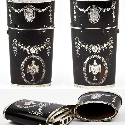 Very good to excellent condition for age and type, the case or etui is as close to perfect as you’ll ever find. Well over 250 years, it hasn’t any lifts of the inlaid silver, and no nips nor chips nor cracks or hairlines on that deep chocolate colored tortoise shell. Hinge and clasp working perfectly. A rare gem from my own collections.